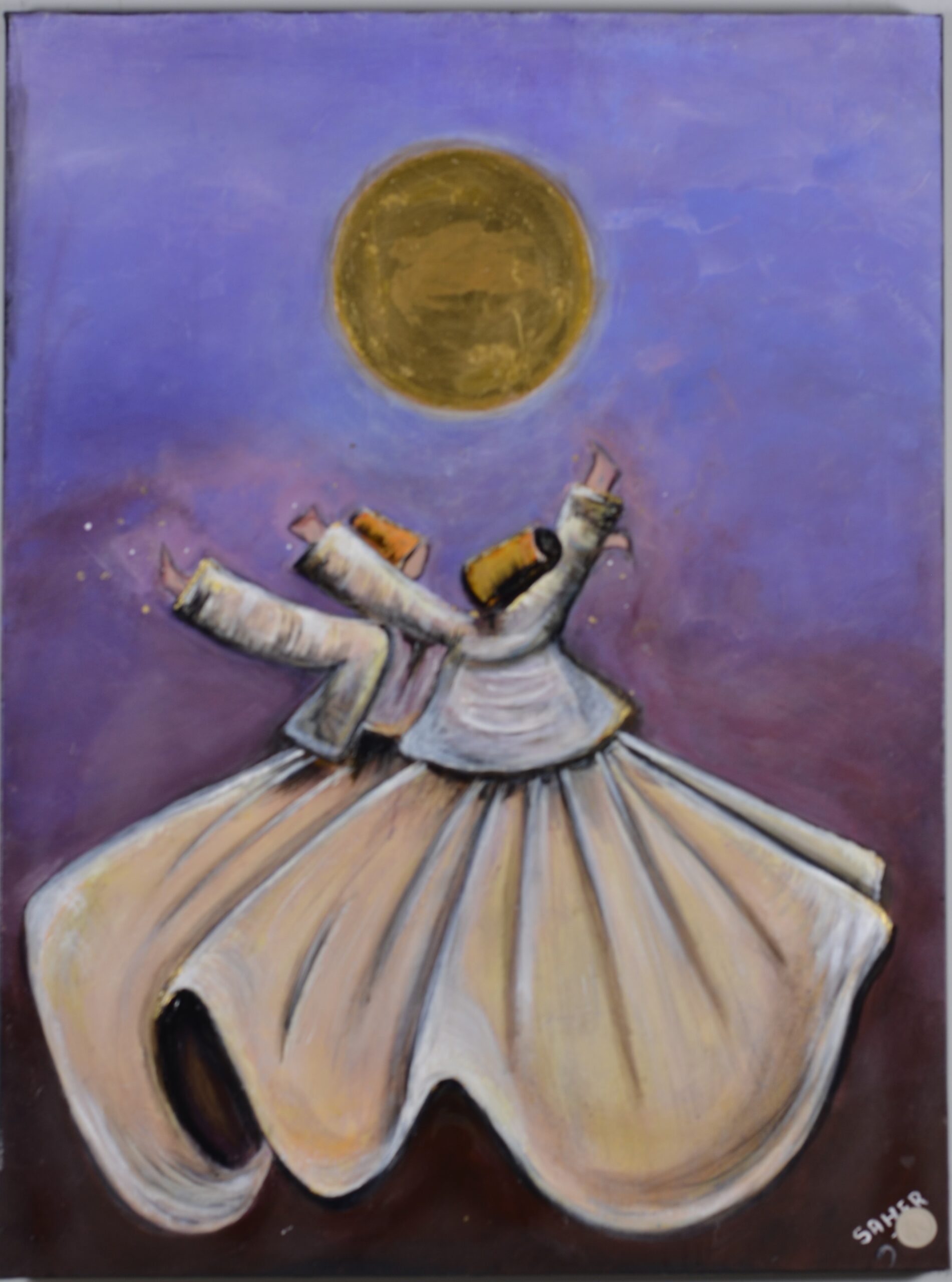 This textured mixed media painting captures the essence of spiritual surrender through the graceful whirl of dervishes under a luminous golden moon. Set against a twilight-toned background, the flowing garments and subtle gold accents reflect the movement of the soul toward divine stillness. Part of the Zen State series, this piece invites the viewer into a moment of meditative ecstasy — where dance becomes prayer and silence speaks.